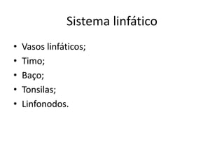 O sistema linfático é composto por vasos linfáticos, timo, baço, tonsilas e linfonodos e auxilia na drenagem dos líquidos do corpo e na remoção de infecções, onde os linfócitos se multiplicam nos linfonodos causando inchaço.