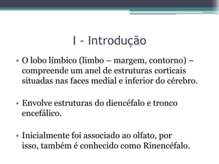 O documento descreve o sistema límbico, incluindo sua neuroanatomia e funções. O sistema límbico é composto por estruturas do lobo límbico e diencéfalo envolvidas no controle das emoções, memória, aprendizagem e regulação do sistema nervoso autônomo. Ele inclui o hipocampo, amígdala, giro cingulado e hipotálamo, conectados através do circuito de Papez.