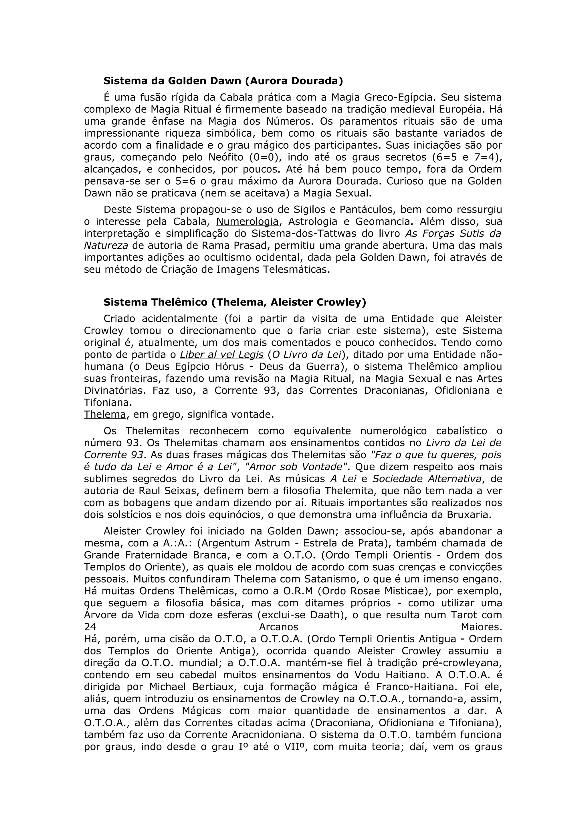 O documento resume diversos sistemas mágicos, incluindo a Golden Dawn, Thelema, Aurum Solis, Salomônico, Planetária, Sangreal, Tattwas, Pathworking, Satânico, Abramelim, Enoquiano e da Bruxaria, descrevendo brevemente os principais aspectos de cada um.