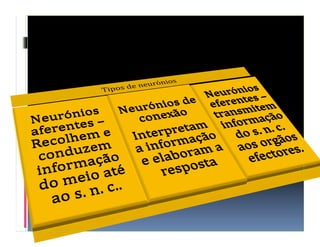 - O documento descreve as estruturas e funções do sistema nervoso central, incluindo a espinal medula e o cérebro.