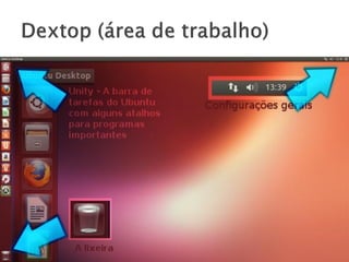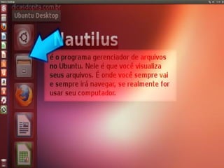 O documento lista os nomes de alunos da turma 1o ano B e discute o sistema operacional Linux, especificamente o Ubuntu. Ele descreve que o Ubuntu é um sistema operacional de código aberto baseado no Linux, que é gratuito e oferece programas livres. Também lista alguns dos principais programas e ferramentas incluídos no Ubuntu.