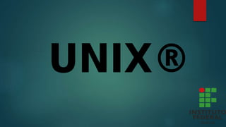 O documento descreve o sistema operacional Unix, incluindo sua história, características e estrutura. Foi criado originalmente por Ken Thompson e Dennis Ritchie em 1965 e é um sistema multitarefa e multiusuário que trata dispositivos como arquivos. Sua estrutura inclui sistemas de arquivos, diretórios e ambientes de texto e gráficos.