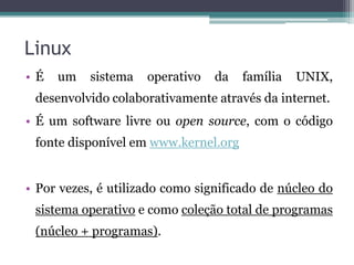 O documento descreve o sistema operativo Linux, incluindo sua história, características, componentes e conceitos-chave. Linux é um sistema operativo de código aberto desenvolvido colaborativamente pela internet com base na arquitetura do Unix. As principais partes do Linux são o núcleo e as distribuições, que adicionam programas ao núcleo.
