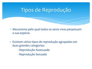 2. São descritos os tipos de reprodução assexuada e sexuada, assim como os processos de fecundação e desenvolvimento embrionário.