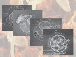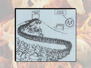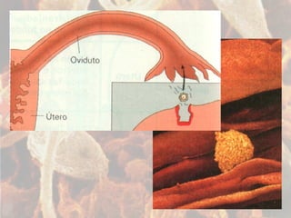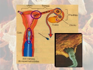 O documento descreve os sistemas reprodutores masculino e feminino. Detalha as estruturas dos órgãos sexuais masculinos como testículos e estrutura do espermatozóide. Descreve também as estruturas femininas como ovários, trompas de Falópio e útero, além dos ciclos ovariano e uterino durante o ciclo sexual.