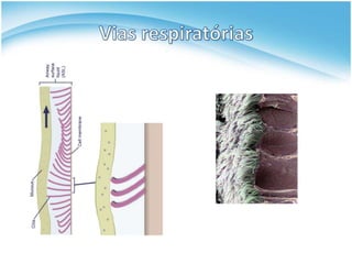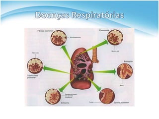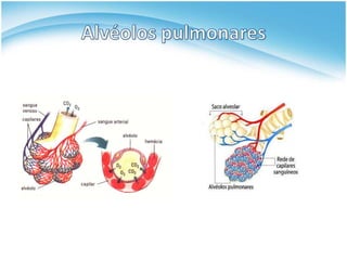 O documento descreve o sistema respiratório humano, incluindo suas funções de troca de gases, órgãos e processos. Os pulmões trocam oxigênio e dióxido de carbono com o sangue, enquanto as vias respiratórias filtram e aquecem o ar inspirado. A respiração ocorre através da contração do diafragma e músculos torácicos durante a inspiração e relaxamento durante a expiração.