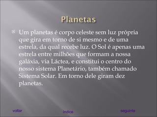 Um planetas écorpo celeste sem luz própria que gira em torno de si mesmo e de uma estrela, da qual recebe luz. O Sol é apenas uma estrela entre milhões que formam a nossa galáxia, via Láctea, e constitui o centro do nosso sistema Planetário, também chamado Sistema Solar. Em torno dele giram dez planetas. voltar índice seguinte