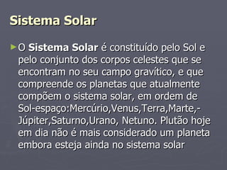 Sistema Solar O Sistema Solar é constituído pelo Sol e pelo conjunto dos corpos celestes que se encontram no seu campo gravítico, e que compreende os planetas que atualmente compõem o sistema solar, em ordem de Sol-espaço:Mercúrio,Venus,Terra,Marte,-Júpiter,Saturno,Urano, Netuno. Plutão hoje em dia não é mais considerado um planeta embora esteja ainda no sistema solar