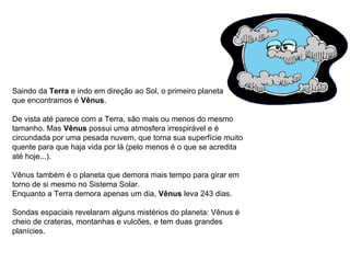 O documento descreve a localização do Sistema Solar na Via Láctea e fornece detalhes sobre os planetas do Sistema Solar, incluindo suas características físicas e órbitas. Também explica as fases da Lua e como a atração gravitacional da Lua causa as marés na Terra.