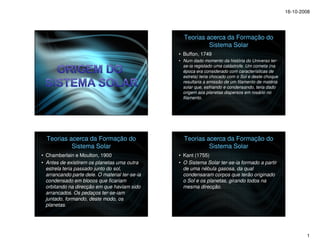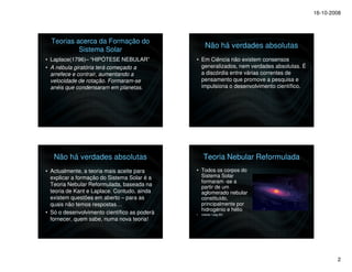 O documento descreve as principais teorias sobre a formação do Sistema Solar ao longo da história, com destaque para a Teoria Nebular e suas reformulações. Resume as etapas da acreção e diferenciação dos planetas a partir de uma nebulosa primordial, resultando na estrutura em camadas da Terra.