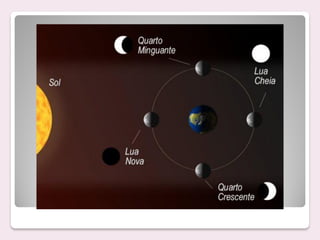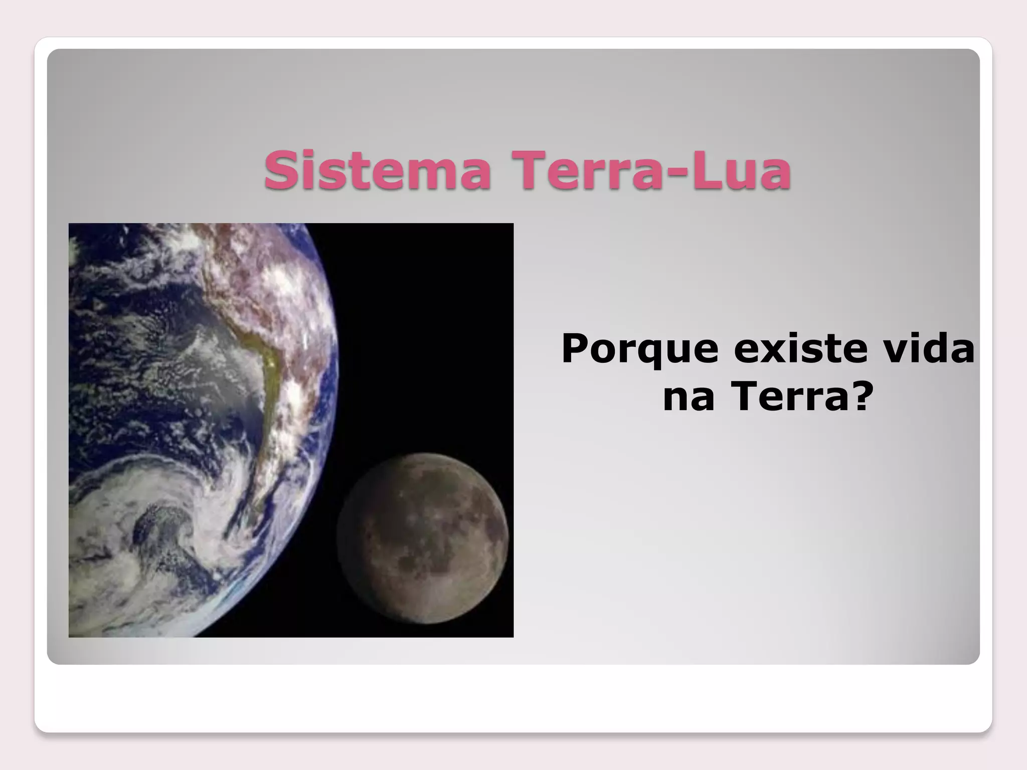 O documento descreve o sistema Terra-Lua, comparando as características da Terra e da Lua. A Lua é um satélite natural da Terra com raio 4 vezes menor, força gravitacional reduzida e sem atmosfera. A superfície lunar distingue-se em continentes e mares lunares, compostos principalmente de basalto.
