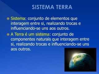 O documento descreve os principais componentes do sistema terrestre - a atmosfera, hidrosfera, litosfera e biosfera - e como eles interagem e influenciam uns aos outros. Também discute os diferentes biomas da Terra, incluindo tundra, deserto, floresta tropical e temperada, e como fatores como precipitação e temperatura afetam a distribuição e tipos de vegetação em cada ecossistema.