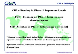 O documento apresenta os princípios e aplicações do sistema de limpeza CIP (Cleaning in Place) em indústrias. Descreve os tipos de limpeza CIP para tanques e tubulações, o programa típico de limpeza CIP e os princípios de design para sistemas CIP eficientes. Também discute as vantagens do CIP sobre outros métodos de limpeza e a importância do CIP para as Boas Práticas de Fabricação.