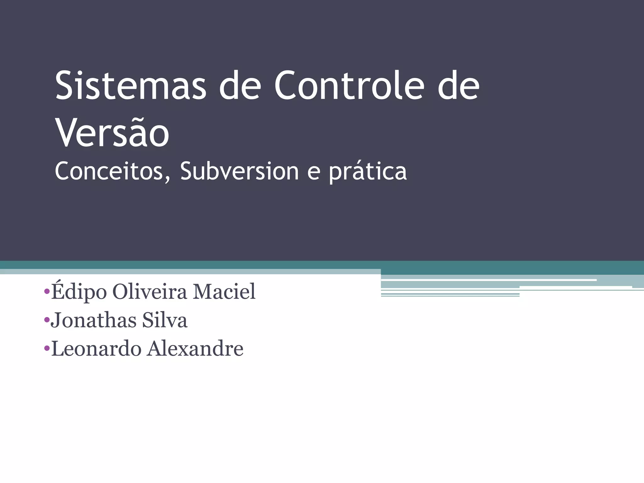 O documento discute sistemas de controle de versão, introduzindo conceitos básicos, terminologia e ferramentas como Subversion. É dividido em seções sobre conceitos, terminologia, características, tipos centralizados e distribuídos, e comandos da ferramenta Subversion.