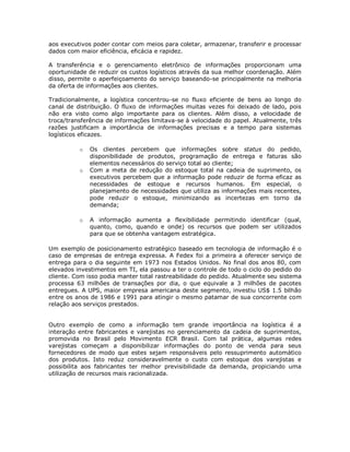 O documento discute a importância dos sistemas de informação para a competitividade logística. Ele explica que sistemas de informação permitem maior eficiência e eficácia nas operações logísticas e na gestão da cadeia de suprimentos. O documento também descreve os diferentes níveis funcionais dos sistemas de informações logísticas, incluindo sistemas transacionais, controle gerencial, apoio à decisão e planejamento estratégico.