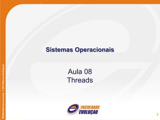 O documento discute threads em sistemas operacionais. Explica que threads compartilham o espaço de endereçamento de um processo e podem executar simultaneamente, diferentemente de processos. Também descreve os modelos de threads, como eles são implementados e as vantagens do uso de múltiplos threads em um processo.