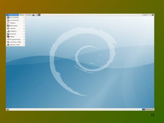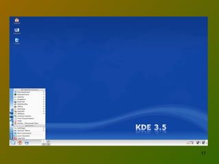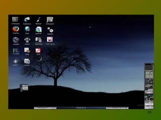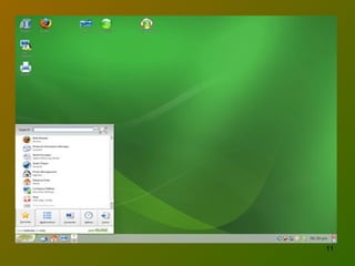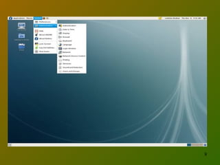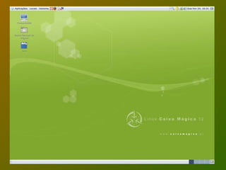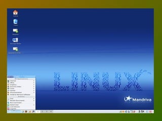 O documento descreve várias distribuições Linux, incluindo Fedora, Ubuntu, Mandriva, OpenSUSE, Caixa Mágica, Debian, Slackware, Gentoo e Arch Linux. Fornece breves descrições sobre suas origens, facilidade de uso, estabilidade e suporte para cada uma.