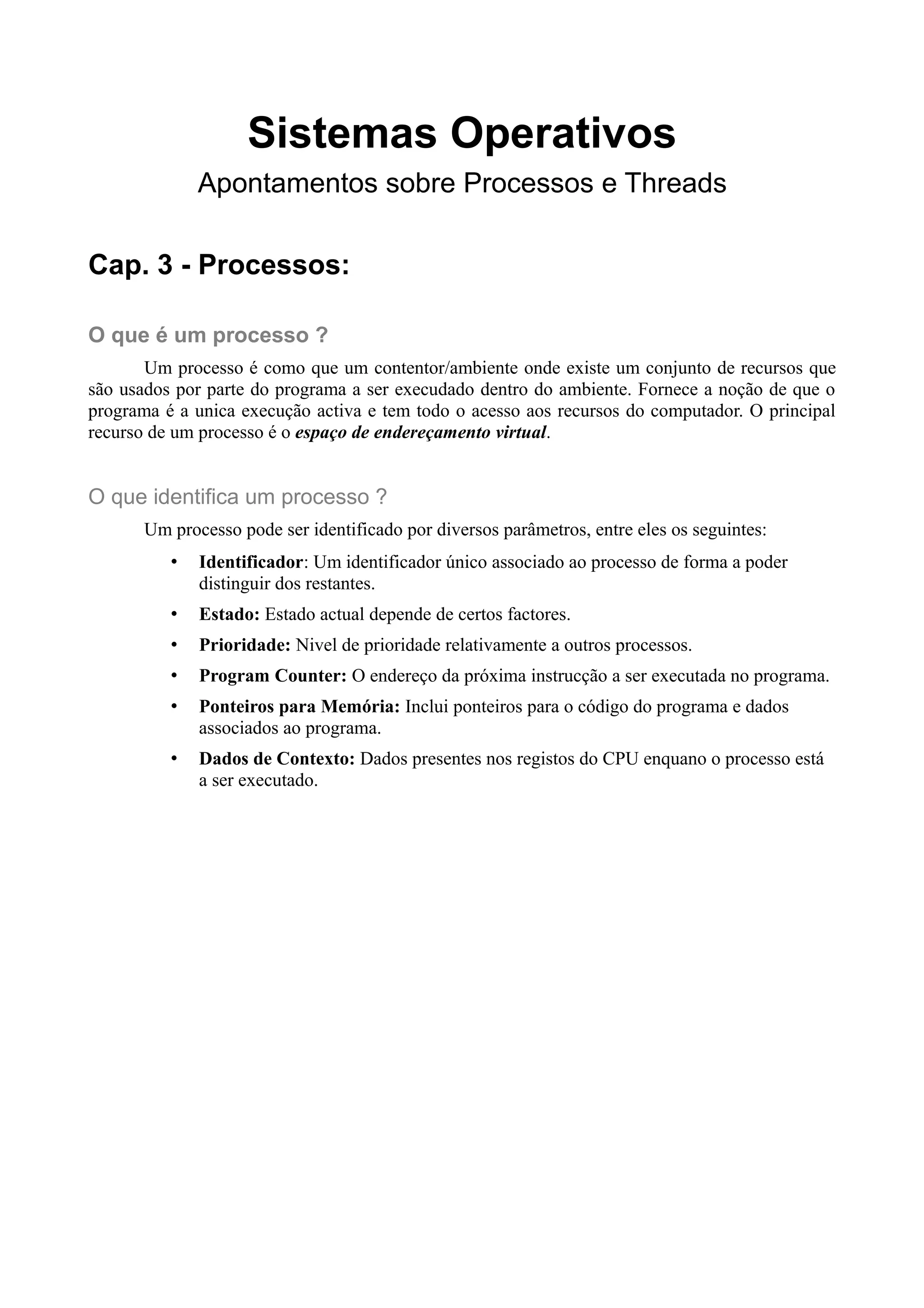 Um processo é um container que fornece recursos e isolamento para um programa em execução. Um processo pode estar em vários estados como new, ready, running, waiting ou terminated. Um sistema operacional usa threads para permitir a execução paralela de tarefas dentro de um mesmo processo.