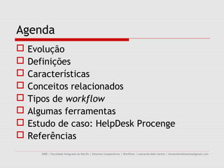 Sistemas Workflow evoluíram desde a década de 1970 para automatizar processos de negócios, definidos como a passagem de documentos entre participantes de acordo com regras. Existem três tipos principais: ad hoc para processos flexíveis, de produção para processos estruturados e repetitivos, e administrativo para processos semi-estruturados. O documento descreve essas características e apresenta um estudo de caso de um sistema de help desk que implementa workflow.