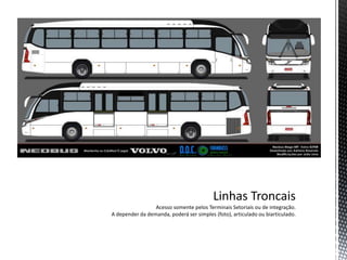 O documento propõe um sistema de transporte público para Feira de Santana composto por linhas troncais e alimentadoras. Seriam instalados terminais setoriais ao longo das avenidas para embarque e desembarque de passageiros. O sistema incluiria também linhas circulares expressas e alimentadoras nos bairros.