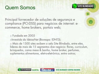 A empresa Site Blindado é um fornecedor de soluções de segurança e compliance para negócios online, fundada em 2005 e com mais de 1500 sites utilizando seu selo de segurança. O documento discute o perfil dos internautas brasileiros e os fatores que influenciam a decisão de compra online, destacando a importância da percepção de segurança para os consumidores. A mensagem principal é que a segurança não é apenas uma necessidade, mas também uma estratégia de venda eficaz.