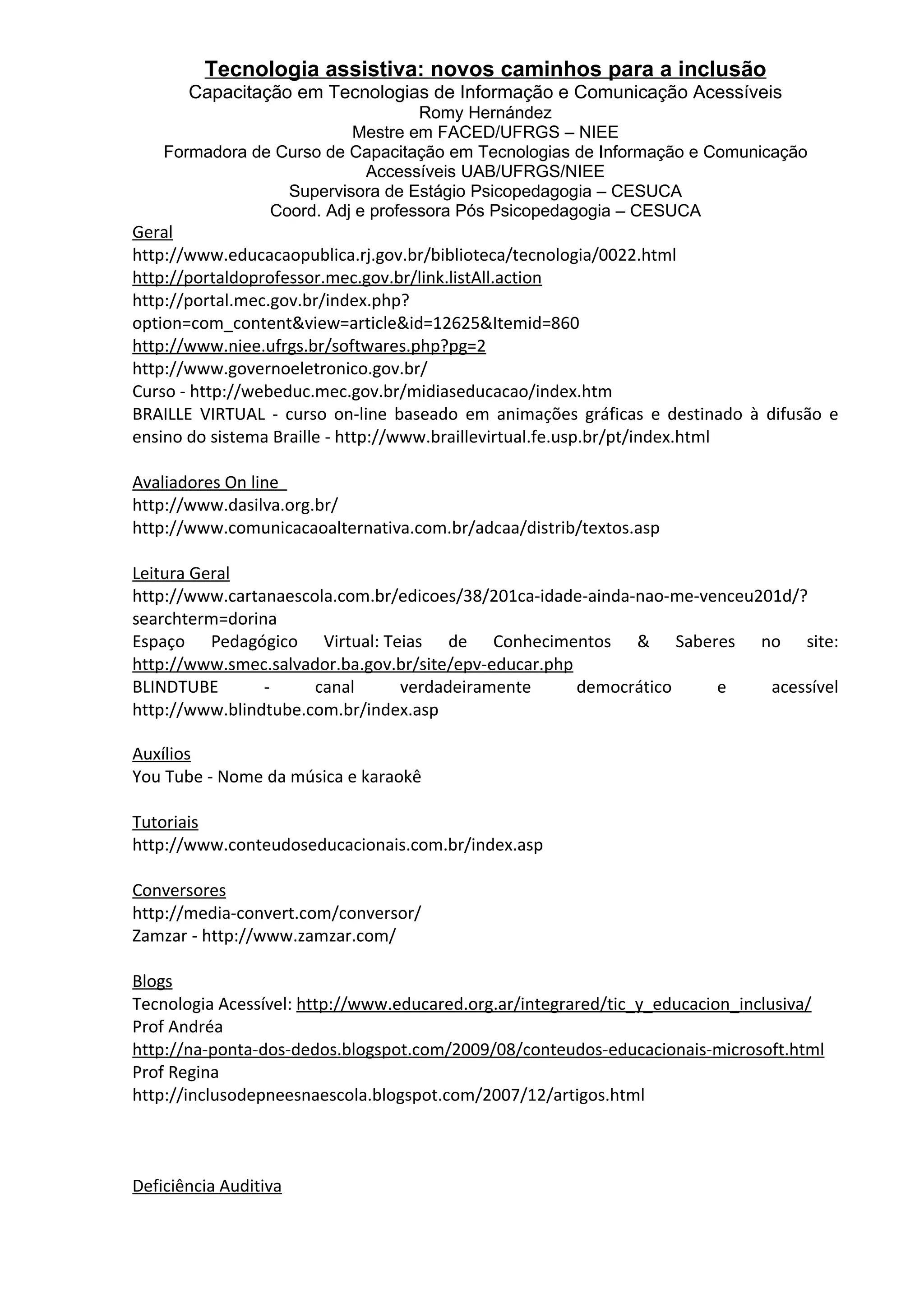 O documento lista diversos recursos de tecnologia assistiva, incluindo sites, softwares e cursos, para apoiar pessoas com deficiência ou necessidades especiais. É fornecida uma grande variedade de ferramentas para deficiências auditivas, visuais, físicas e mentais. Muitos desses recursos são gratuitos e acessíveis on-line.