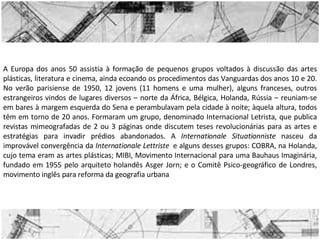 2) A Internationale Situationniste surgiu da convergência do Internacional Letrista com outros grupos e criticava a sociedade de consumo e a cultura mercantilizada.