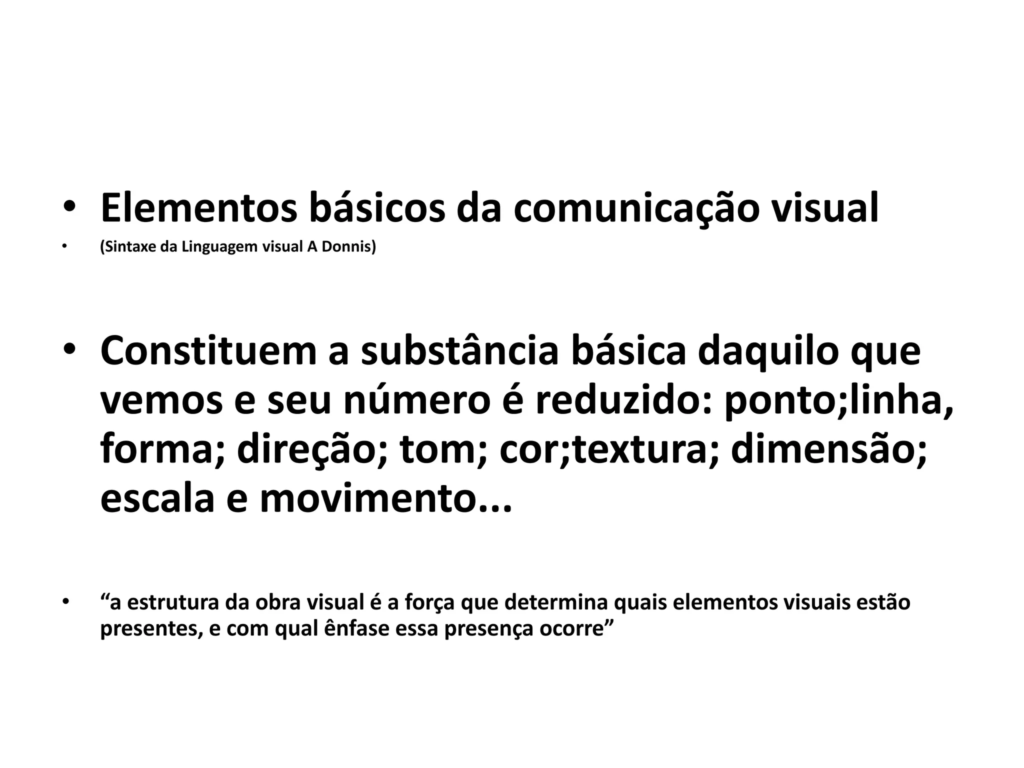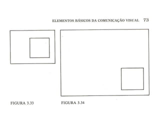O documento discute os elementos básicos da comunicação visual, incluindo ponto, linha, forma, direção, tom, cor, textura, escala e movimento. Explica como esses elementos podem ser combinados e modificados para transmitir significados e expressar diferentes estados de espírito. Também discute como a percepção desses elementos é afetada pela proximidade, tamanho relativo e disposição espacial.