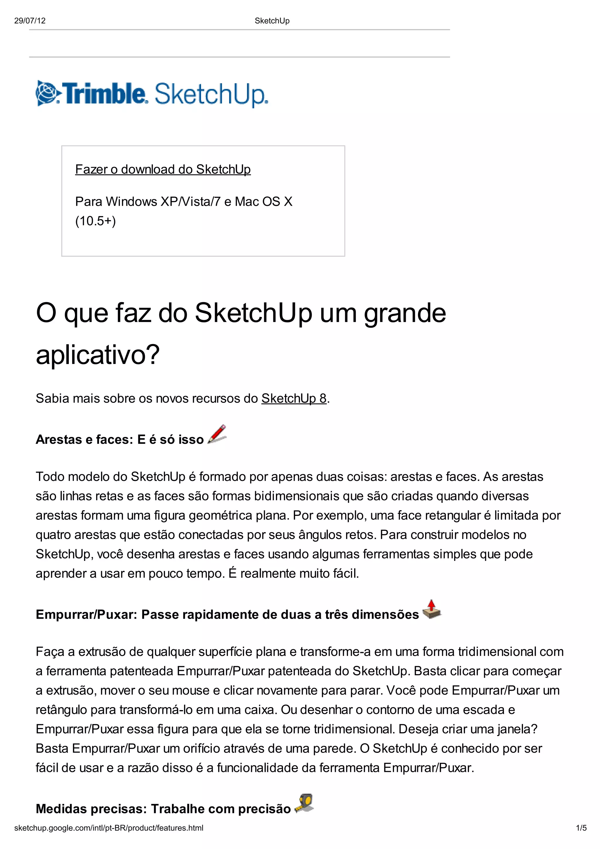 O documento descreve as principais ferramentas e recursos do software SketchUp para modelagem 3D, incluindo a capacidade de criar modelos usando apenas arestas e faces, a ferramenta Empurrar/Puxar para criar formas 3D, e a capacidade de adicionar detalhes como dimensões, texturas e sombras.
