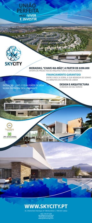 SKYCITY | Inovação, luxo e qualidade de vida numa paisagem deslumbrante. Venha morar a 5 minutos do centro de Lisboa, numa moradia de sonho, desenhada e projectada para si. Para mais informações, contacte-nos através de: geral@jpsconsulting.pt www.jps4housing.com