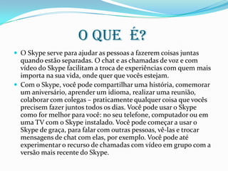 O documento explica como usar o Skype para se comunicar com outras pessoas através de chamadas de voz e vídeo, enviar arquivos e mensagens de chat quando estiverem separados fisicamente. Detalha como adicionar contatos no Skype pesquisando por e-mail, número de telefone ou nome e enviando uma solicitação de amizade.