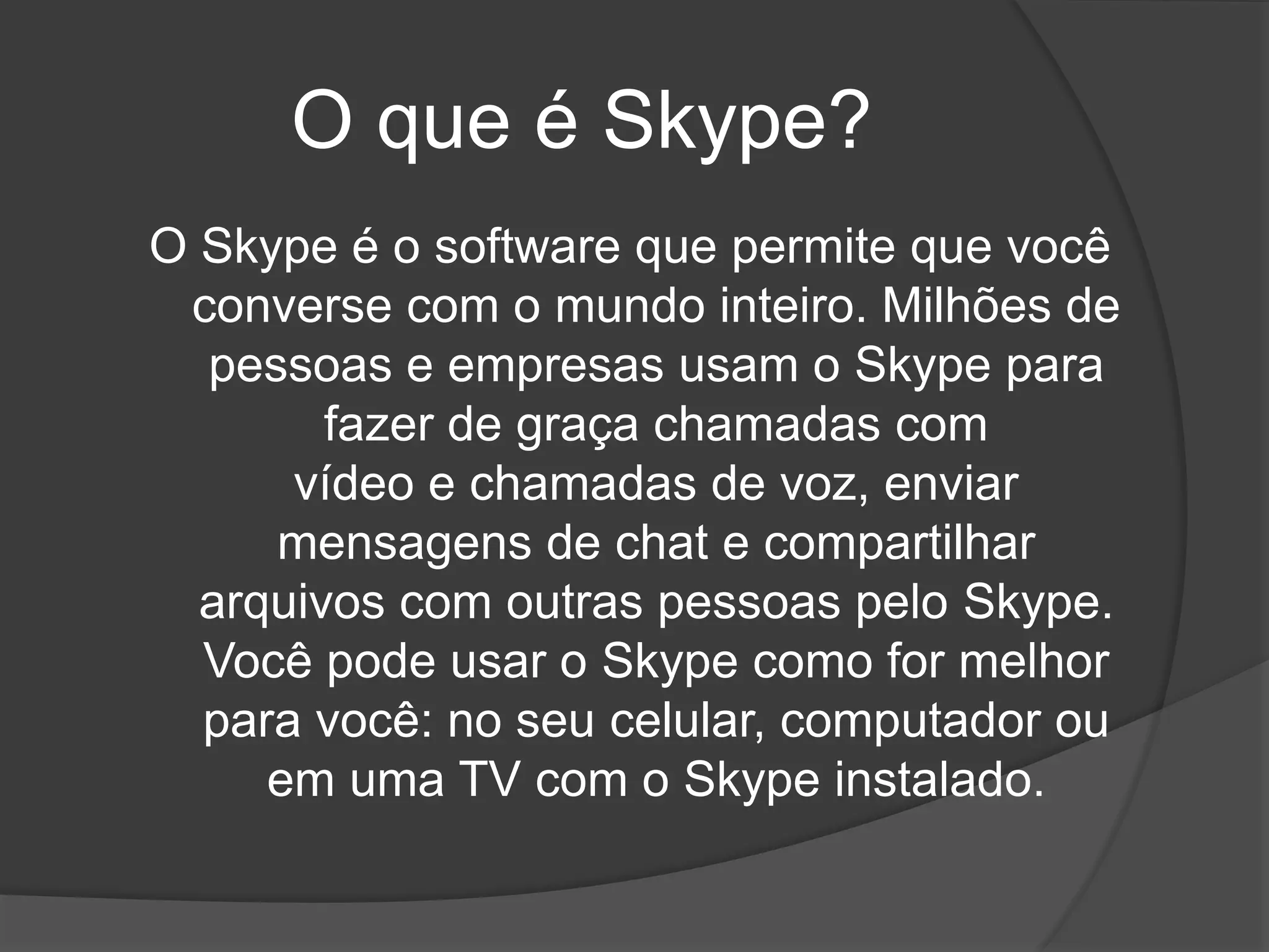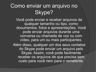 O documento explica como usar diferentes recursos do Skype, incluindo como enviar arquivos, conversar, adicionar amigos e manter contato com eles de forma gratuita usando o Skype no computador ou celular.