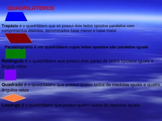 O documento descreve figuras geométricas planas incluindo quadriláteros, triângulos e circunferência. Quadriláteros incluem trapézios, paralelogramos, retângulos e quadrados. Triângulos incluem equiláteros, isósceles e escalenos. A circunferência é definida como todos os pontos no plano a uma distância r do centro.