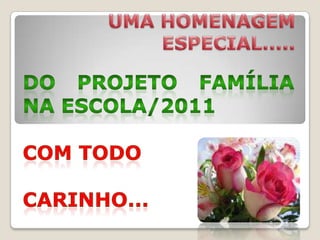 Este documento homenageia as mães educadoras que participam do Projeto Família na Escola em 2011. Ele descreve as mães como presentes, dedicadas, responsáveis, esforçadas, carinhosas e educadas. O documento também afirma que sem o apoio dessas mães, a educação na escola não seria a mesma.