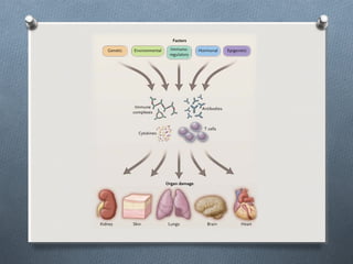 O documento discute o lúpus eritematoso sistêmico (LES), uma doença autoimune crônica que causa inflamação em vários órgãos. Apresenta os principais sintomas, critérios de diagnóstico, exames complementares e complicações da doença, incluindo manifestações articulares, cutâneas, cardiopulmonares, renais e neurológicas. Também aborda a epidemiologia, fatores de risco e opções de tratamento para LES.