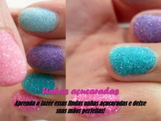 O documento fornece dicas de maquiagem para melhorar traços faciais considerados defeituosos e também inclui tutoriais para fazer unhas decoradas com açúcar e gel, além de sugerir organização dos produtos de maquiagem.