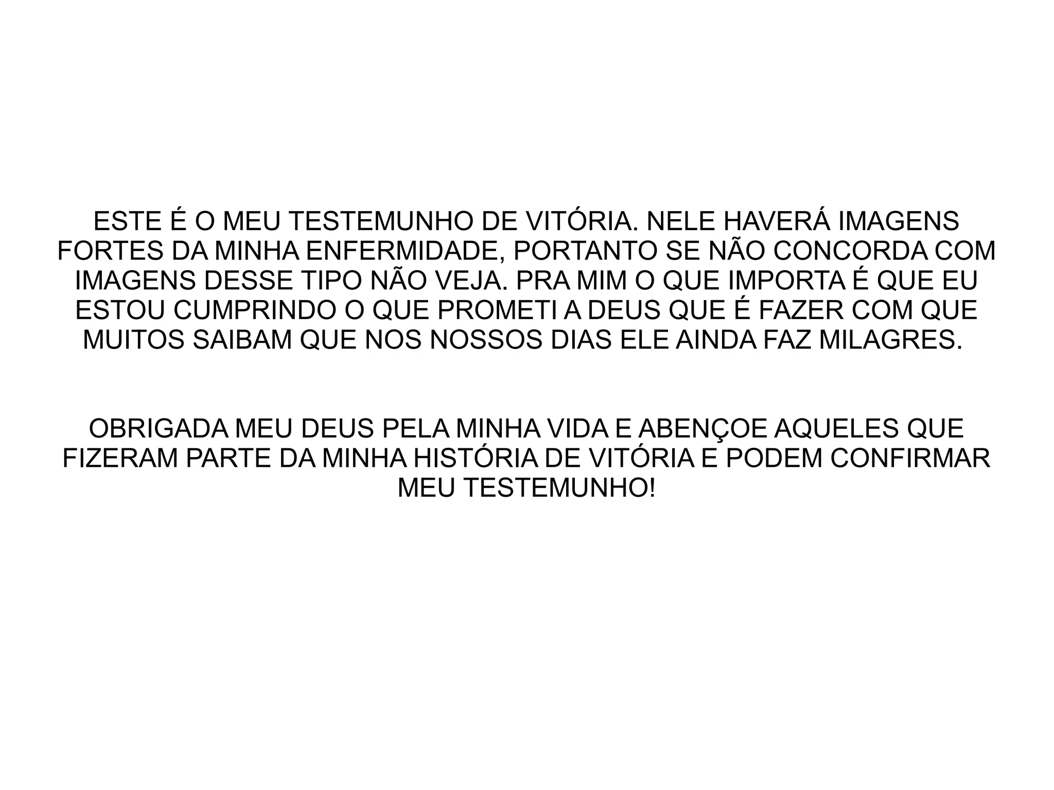 Este documento relata o testemunho de vitória de uma pessoa após passar por uma série de problemas de saúde. Ela começou com um pequeno machucado no pé que foi piorando devido a um diagnóstico errado e medicamentos incorretos. Após 37 dias internada em um hospital público com dores intensas e tomando vários antibióticos, ela teve uma parada cardíaca. No entanto, após receber uma mensagem de fé de uma enfermeira desconhecida e orações, sua condição começou a melhorar