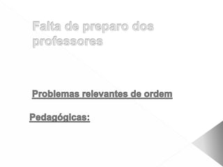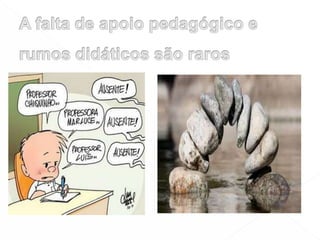 O documento discute os desafios da implementação de novas leis de educação no Brasil, incluindo a falta de recursos adequados, antagonismo durante as mudanças, e práticas deficientes de avaliação e gestão pedagógica nas escolas, como avaliar apenas os alunos fracos sem identificar as lacunas de aprendizagem. Também menciona formas de recuperação da aprendizagem na sala de aula.