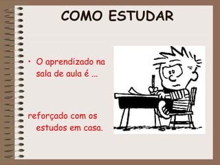 O documento fornece dicas sobre como estudar em casa de forma efetiva, como escolher um espaço tranquilo e bem iluminado para estudar, manter os materiais organizados, estabelecer uma rotina de estudos e horários adequados, e a importância do descanso.
