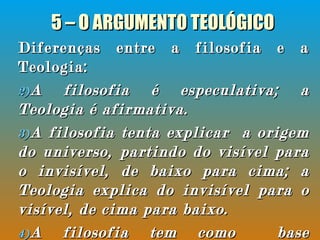 Este documento discute o Argumento Teológico para a existência de Deus. Ele afirma que Deus se revelou a humanidade através da Bíblia e de Jesus Cristo. A Bíblia é considerada prova suficiente da existência de Deus, já que seres humanos não poderiam conceber sozinhos um Deus perfeito. A filosofia especula sobre a existência de Deus, enquanto a Teologia parte do princípio de que Deus existe e é revelado nas Escrituras.