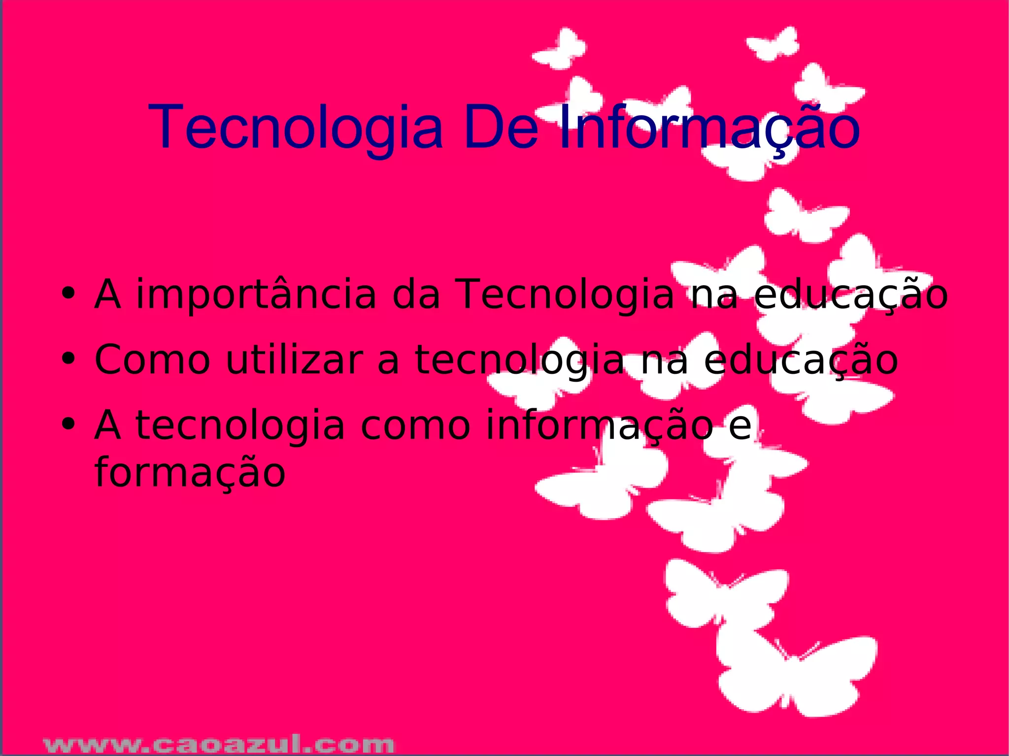 O documento discute a importância da tecnologia na educação, como utilizá-la e como ela pode fornecer informação e formação. Ele destaca os benefícios da tecnologia para a educação, como editar textos e navegar na internet, e como a tecnologia pode especializar profissionais e otimizar o desempenho no trabalho.