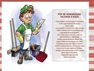 1) O documento descreve os procedimentos para limpeza de reservatórios de água, incluindo agendamento, esvaziamento parcial, inspeção e limpeza, desinfecção e finalização.
