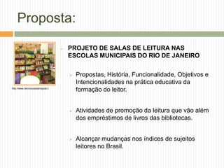 O documento discute a importância das salas de leitura nas escolas públicas do Rio de Janeiro para a formação de leitores. Aponta que o Brasil tem baixos índices de leitura e que as salas de leitura podem promover o hábito da leitura através de atividades que vão além do empréstimo de livros. Defende que a escola deve estimular o prazer pela leitura para formar cidadãos leitores.
