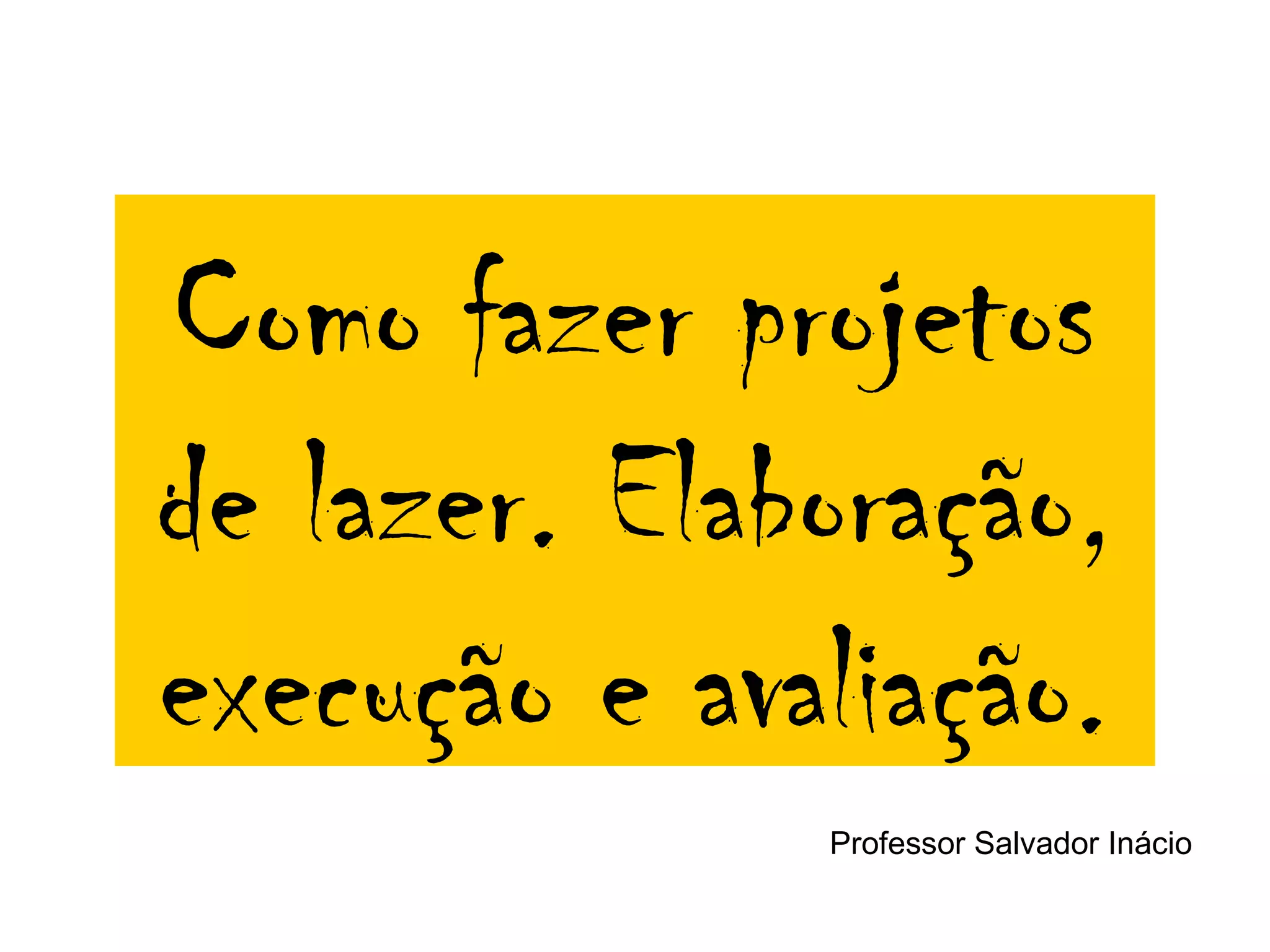 O documento discute as principais fases de projetos de lazer: identificação, elaboração, execução e avaliação. A fase de identificação envolve identificar a oportunidade e analisar a viabilidade. A elaboração inclui diagnóstico, formulação de objetivos e atividades. A execução envolve realizar as atividades e a avaliação ocorre durante e após a execução para analisar o processo e resultados.