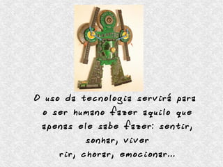 O documento discute como a tecnologia pode ser usada para humanizar o processo educativo ao permitir que os seres humanos se concentrem em atividades como sentir, sonhar e emocionar, em vez de dominá-los. A tecnologia deve ser dominada pelo ser humano e não o contrário, e embora seja difícil viver sem ela hoje, a tecnologia continuará surpreendendo.