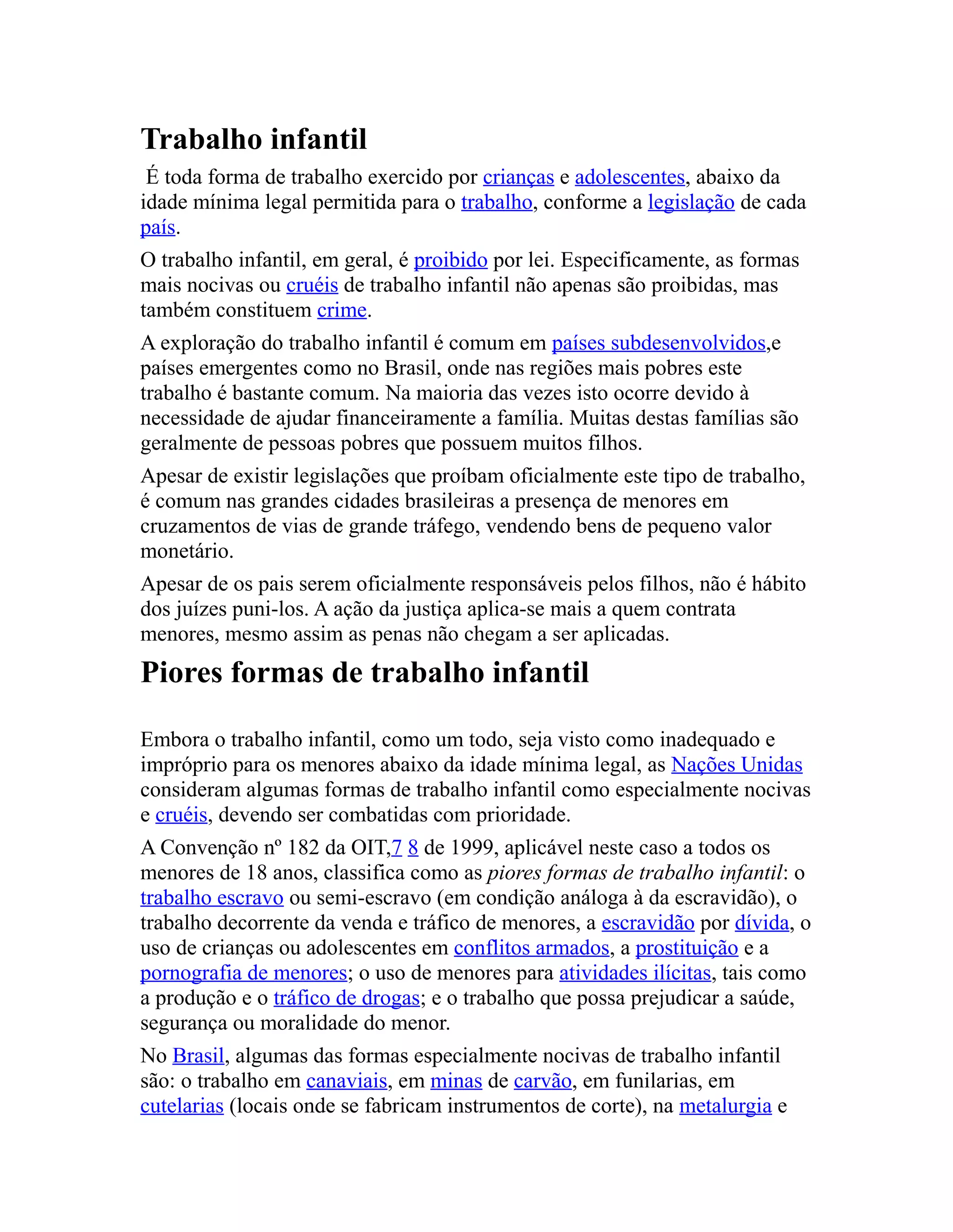 O documento discute o trabalho infantil, definindo-o como qualquer trabalho realizado por crianças abaixo da idade legal permitida. Embora proibido por lei, o trabalho infantil é comum em países em desenvolvimento devido à pobreza. As piores formas de trabalho infantil incluem escravidão, tráfico, conflitos armados e atividades que prejudiquem a saúde da criança.