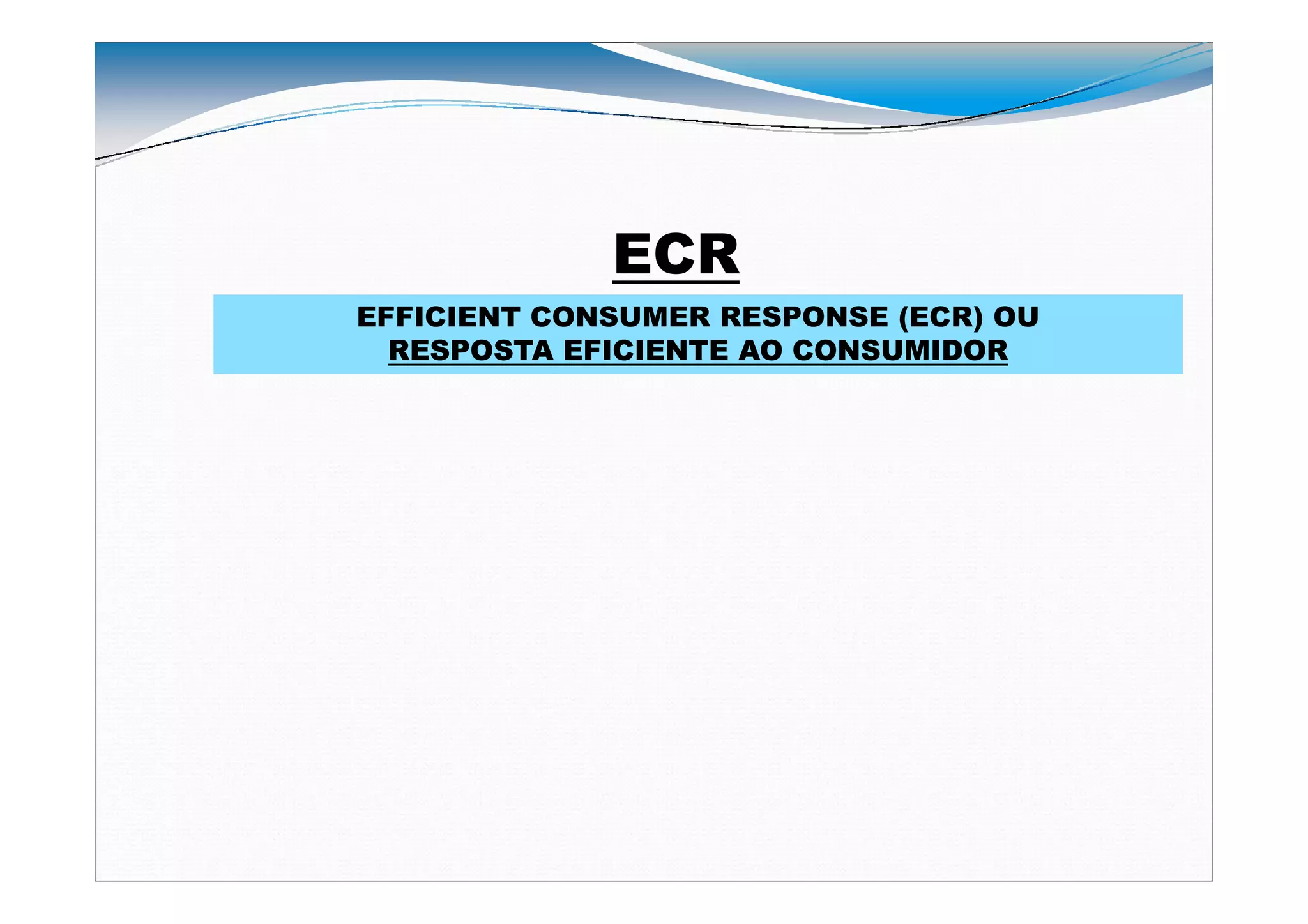 ECR ou Resposta Eficiente ao Consumidor é uma estratégia de distribuição na qual fornecedores, atacadistas e varejistas trabalham juntos para oferecer maior valor ao consumidor, baseada no sistema "just-in-time" da indústria supermercadista. Ferramentas como gerenciamento de categoria, reposição contínua, introdução e promoção de produtos apoiam as estratégias do ECR.