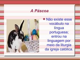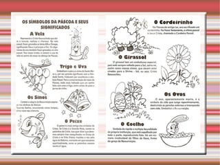 O documento resume a origem e significado da Páscoa no judaísmo e cristianismo, destacando os principais elementos e símbolos. Explica que a Páscoa judaica comemorava a libertação dos israelitas do Egito, enquanto a cristã celebra a ressurreição de Cristo. Também discute os símbolos modernos da Páscoa e sua visão para os evangélicos.