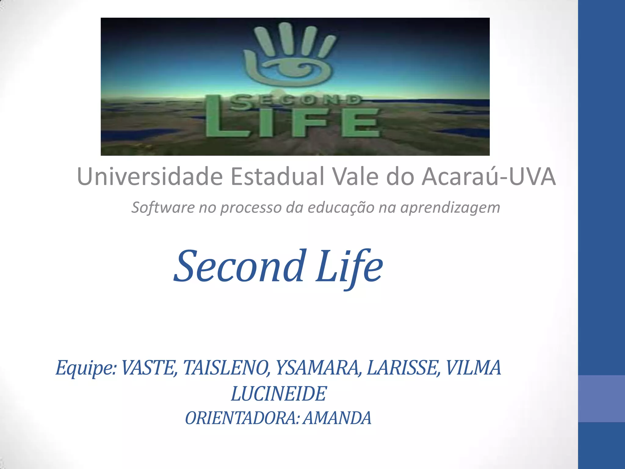 O documento discute o Second Life, um mundo virtual 3D onde usuários podem criar avatares e interagir. Ele descreve como ferramentas como chat e notas podem ser usadas para comunicação e ensino, e como simulações no Second Life podem enriquecer a aprendizagem. Também analisa se o Second Life pode ser considerado um ambiente de aprendizagem e como a interação ocorre em cursos de educação a distância nele.