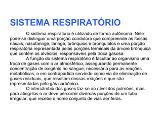O documento discute a anatomia e fisiologia do sistema respiratório, destacando suas porções condutora e respiratória, e a importância da troca gasosa. Detalha os componentes como nariz, faringe, laringe, traqueia, brônquios e pulmões, além de explicar o processo de ventilação e o transporte de gases. Também aborda a função da pleura e dos movimentos respiratórios na mecânica da ventilação pulmonar.